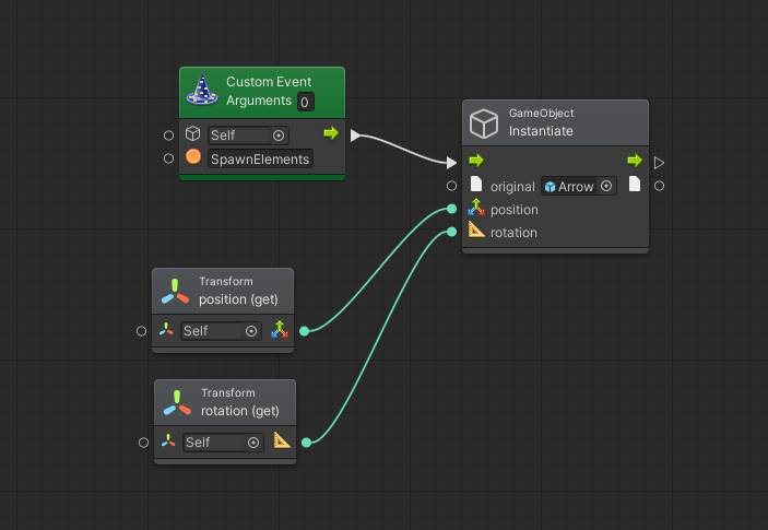 In modo del tutto simile a quanto fatto nella Lezione 03, generiamo un prefab (Arrow) aggiungendo un nodo Instantiate, come mostrato nella seguente immagine: